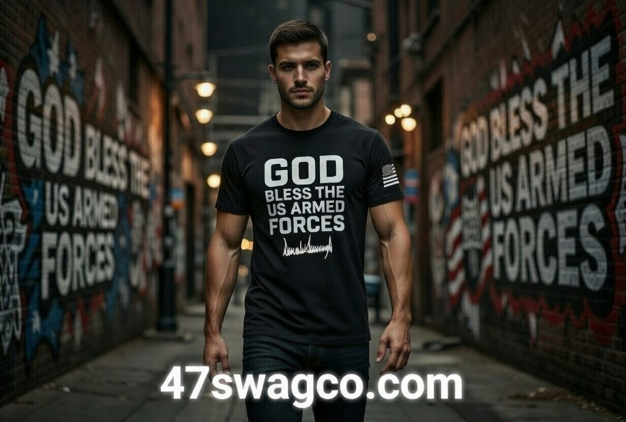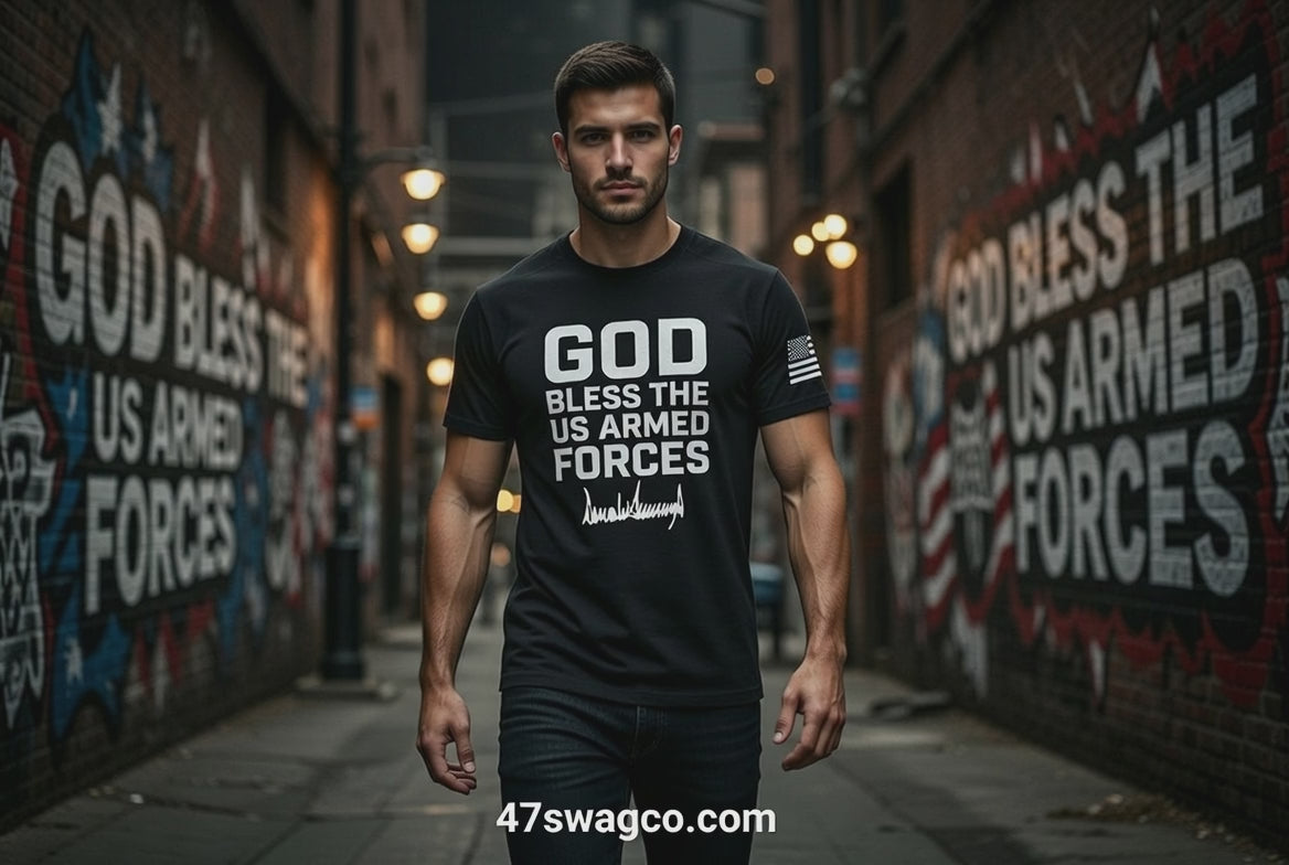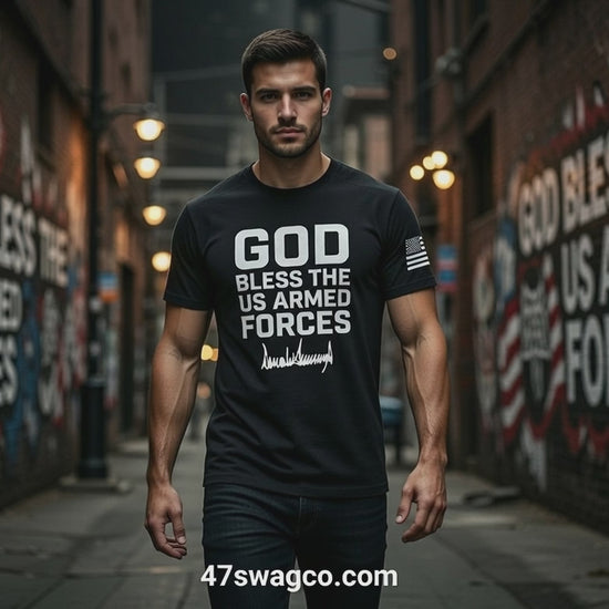 Built for the real ones—black, breathable, no-fuss fit that shows off your build without squeezing. Bold white chest print: "GOD BLESS THE US ARMED FORCES" in solid block, capped with Donald Trump's authentic silver signature scrawl. Left sleeve gets the American flag patch—quiet power, loud pride.